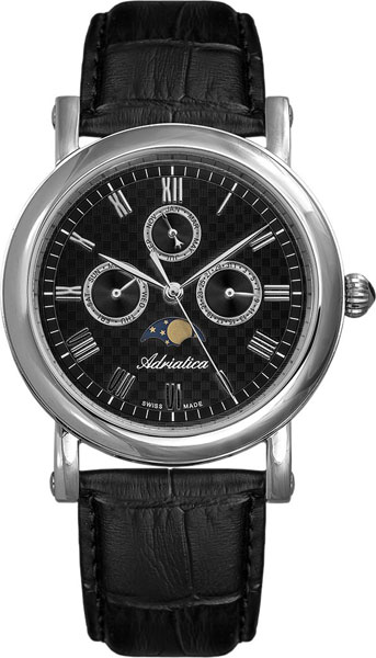 Кварцевые часы. Калибр Ronda 706. Водостойкость WR 50. Часы, минуты, секунды, дата, день недели, месяц, фазы Луны. Корпус выполнен из нержавеющей стали. Минеральное стекло. Кожаный ремешок.