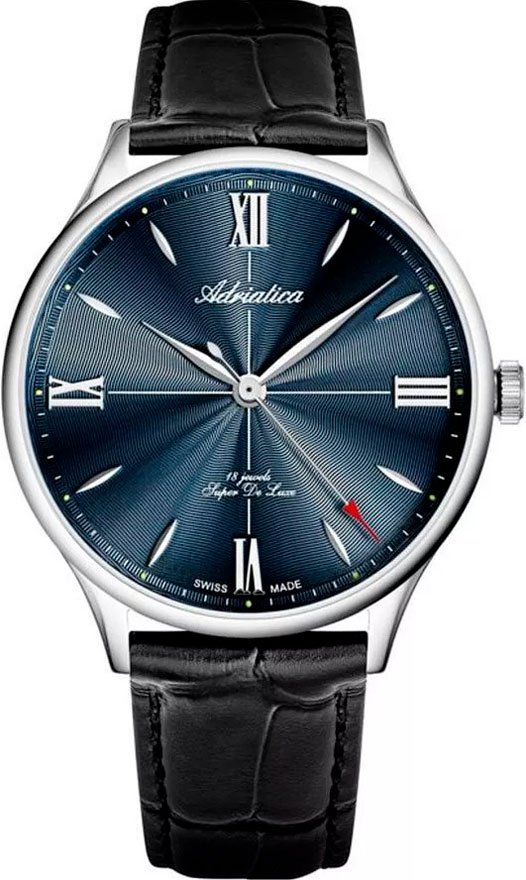 Механические наручные часы. В механизме 18 камней, частота 28800 полуколебаний в час. Запас хода 42 часа. Гильошированный циферблат. Метки в виде римских цифр и штрихов. Прозрачная задняя крышка. Кожаный ремешок с классической застежкой.