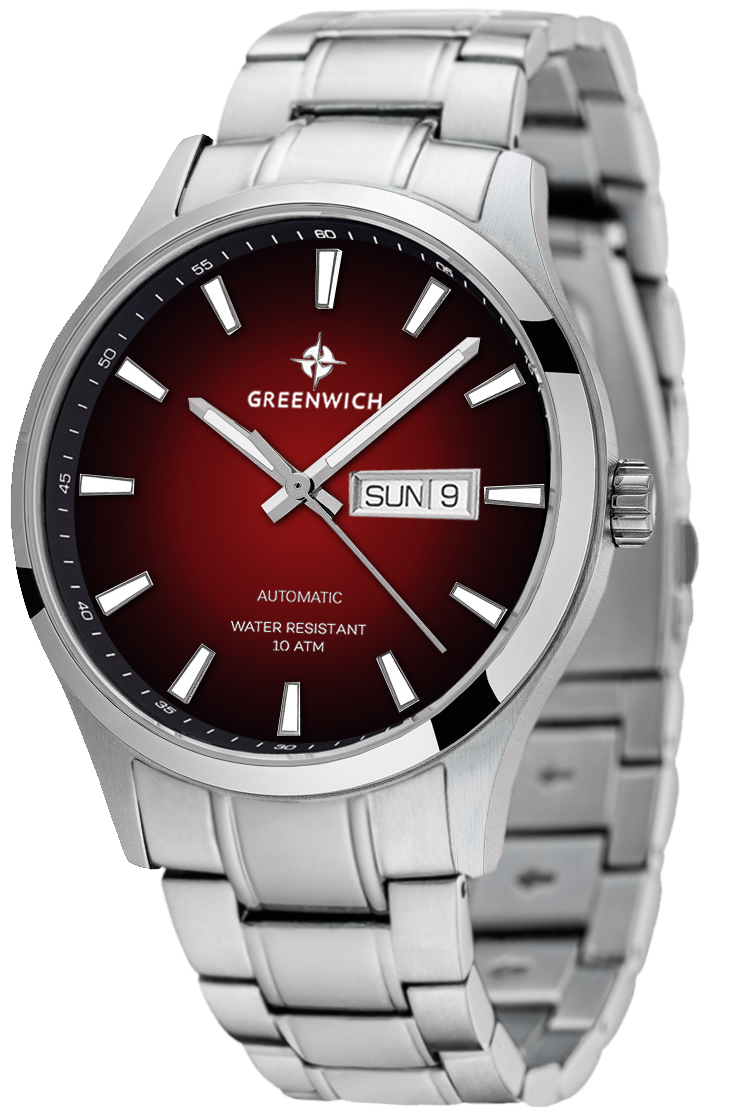 На фоне циферблата с полировкой и эффектом градиента расположились накладные риски и крупные стрелки. Они хорошо читаются при любых условиях освещения — люминесцентный состав, которым покрыты эти элементы, светится в темноте. В модели установлено минеральное стекло. Повышенная водостойкость составляет 10 атмосфер.