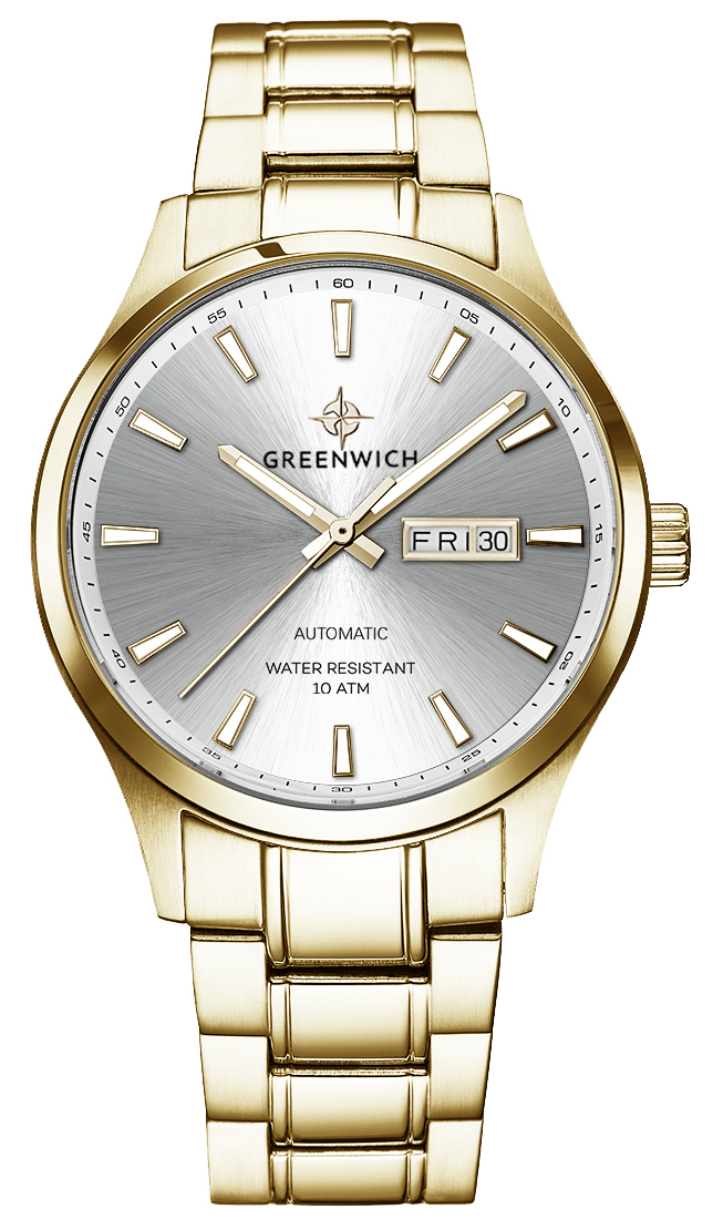 Элегантность, классические линии и уважение традиций задают тон дизайну часов серии Good Luck. Корпус модели, состоящий из трех частей, можно с уверенностью назвать массивным: его диаметр равен 43 мм. Корпус сделан из нержавеющей стали с PVD-покрытием из желтого золота, двумя видами полировки: зеркальной по безелю и матированием. Задняя крышка прозрачная: вы сможете без проблем любоваться автоматическим механизмом TMI, на роторе которого выгравирован силуэт парусника, символа английских мореходов, и название серии. На фоне белого циферблата с полировкой и эффектом градиента расположились накладные риски и крупные стрелки. Они хорошо читаются при любых условиях освещения — люминесцентный состав, которым покрыты эти элементы, светится в темноте. Окошко даты и дня недели выделяет стальная рамка. В модели установлено минеральное стекло. Повышенная водостойкость составляет 10 атмосфер. Часы дополняет браслет из нержавеющей стали с удобной в использовании и надежной застежкой-клипсой. Автоматические часы Greenwich хорошо подходят для того, чтобы носить их каждый день. Их универсальный дизайн сочетается практически с любыми предметами гардероба, а механизм заводится, находясь на запястье владельца.