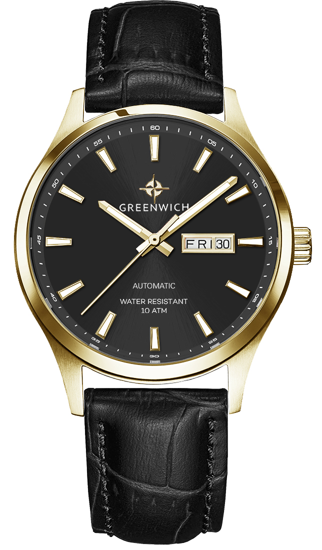 Элегантность, классические линии и уважение традиций задают тон дизайну часов серии Good Luck. Корпус модели, состоящий из трех частей, можно с уверенностью назвать массивным: его диаметр равен 43 мм. Корпус сделан из нержавеющей стали с PVD-покрытием из желтого золота, двумя видами полировки: зеркальной по безелю и матированием. Задняя крышка прозрачная: вы сможете без проблем любоваться автоматическим механизмом TMI, на роторе которого выгравирован силуэт парусника, символа английских мореходов, и название серии. На фоне черного циферблата с полировкой и эффектом градиента расположились накладные риски и крупные стрелки. Они хорошо читаются при любых условиях освещения — люминесцентный состав, которым покрыты эти элементы, светится в темноте. Окошко даты и дня недели выделяет стальная рамка. В модели установлено минеральное стекло. Повышенная водостойкость составляет 10 атмосфер. Часы дополняет ремешок из натуральной кожи черного цвета с прошивкой. Автоматические часы Greenwich хорошо подходят для того, чтобы носить их каждый день. Их универсальный дизайн сочетается практически с любыми предметами гардероба, а механизм заводится, находясь на запястье владельца.